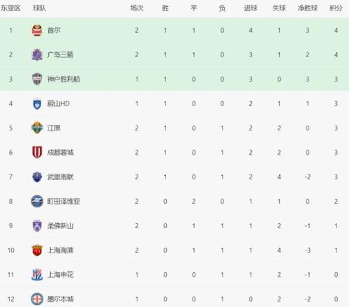 在积分榜上,首尔4分排名第1。广岛三箭也是4分。有5支球队都是3个积分,包括成都蓉城。成都蓉城排名第6。而上海海港2轮只拿到1分,排名倒数第3名。上海申花只踢了1轮,0个积分,排名倒数第2。而墨尔本城也是0分,排名倒数第1。
