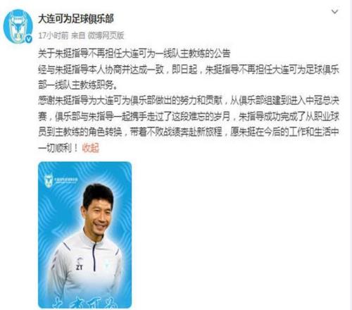 朱挺自宣:由于战绩不佳,未达到俱乐部预期标准,经与大连可为俱乐部协商:即日起,本人不再担任大连可为俱乐部主教练职位。朱挺写道:“一同战斗10轮正式比赛,共6胜4平,有惊喜也有遗憾,更多的是对自己能力不足的焦急忐忑,未来一定充分学习,夯实基础,努力提高业务水平,为大连足球做微薄的贡献,少说空话多干事实,用这次宝贵的联赛经验服务更多,对足球有理想有憧憬的球员!”