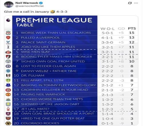 由于阿莫林在老特拉福德承受着巨大压力,他在俱乐部的未来正受到前所未有的质疑。而沃诺克在一条列出各队排名并附有双关语的帖子下做出了回应。(积分榜上曼联的名字被替换成了:“呼叫尼尔-沃诺克”。)
