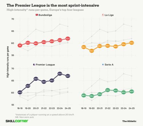 SkillCorner的追踪数据显示,每场比赛,英超中的高强度跑动(速度超过每小时20公里/12.4英里)次数比西班牙、德国和意大利的顶级联赛更多。