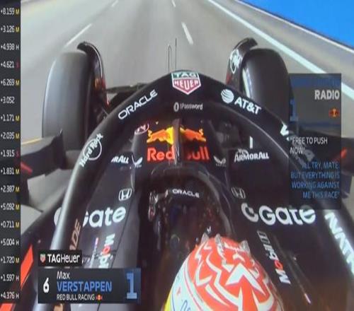 第23圈,维斯塔潘做出了最快单圈,车队让他全速前进,但他表示自己会竭尽所能可感觉所有的事都在和他做对(此前赛车遇到了降档问题)。此时他和诺里斯的差距在20秒左右,若诺里斯进站他依旧将大概率回到诺里斯身前。