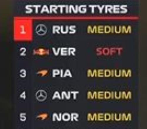 起步轮胎方面,前十名车手中仅维斯塔潘(第2)、哈贾尔(第8)和阿隆索(第10)搭载软胎,其余车手均为中性胎起步,这展现出了三人和他们的车队极为激进的策略!
