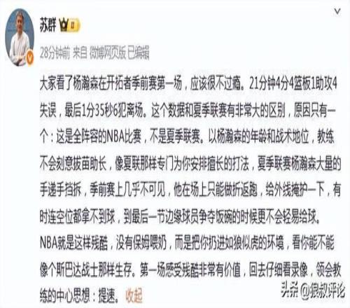 杨瀚森NBA首秀4分4板引热议!苏群:NBA就是这样残酷如狼似虎环境