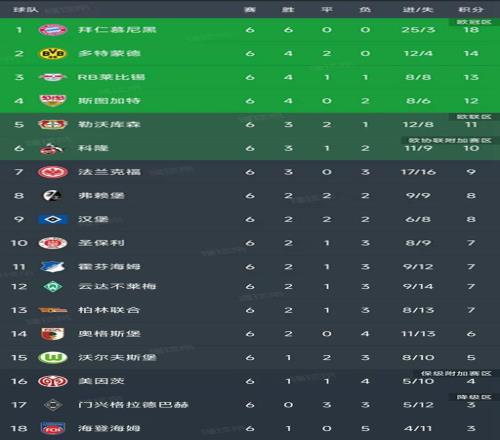 德甲第6轮所有比赛结束,最新积分榜如下!