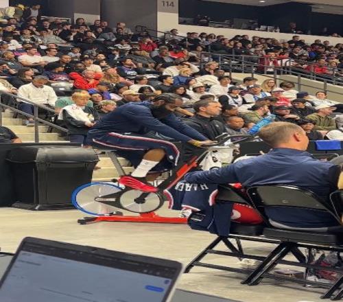 非常认真!比赛期间哈登在场边进行完整的单车训练
