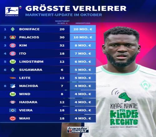 雷速体育10月14日宣 德国转会市场更新了德甲球员身价,并列出了更新后的德甲球员身价跌幅排行榜,目前租借加盟不莱梅的药厂中锋博尼法斯以2000万欧跌幅位列第一。