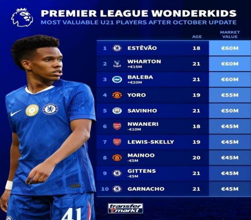 本月17日德转更新英超球员身价,同时列出了英超U21球员身价榜,埃斯特旺、亚当-沃顿、巴莱巴三人6000万欧身价最高。