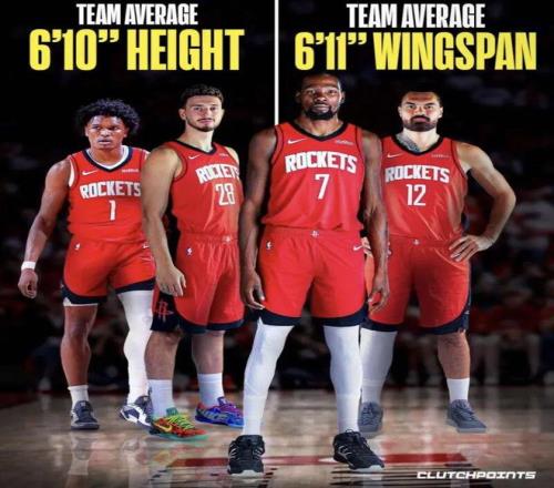 你敢相信,火箭首发5人竟然4人身高6尺11(2米11),最矮的阿门也2米01,首发平均身高6尺10(2.08米),联盟能排出这样有实力的死亡五大的,也就只有火箭了。