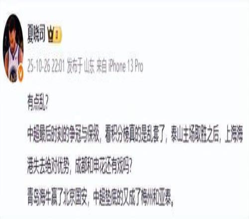 山东媒体人夏晓司老师直言有点乱:“中超最后时刻的争冠与保级,看积分榜真的是乱套了,泰山主场取胜之后,上海海港失去绝对优势,成都和申花还有戏吗?青岛海牛赢了北京国安,中超垫底的又成了梅州和亚泰。