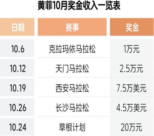 所以,以2小时38分完赛的黄菲笑言,好多人没细看竞赛规则,说她长沙7万美元入账。其实不然,她的长沙马拉松奖金实为4.5万美元。不过,纵然长沙的奖金收入少于西安,但她两场加起来的税前奖金收入有12万美元。