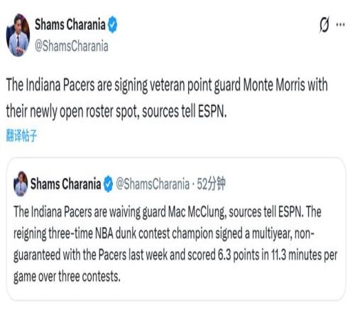 步行者一签一裁!三届扣篮王麦克朗被放弃后卫莫里斯加盟印城