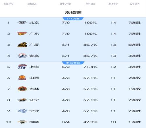 北京时间12月28日晚上,CBA常规赛迎来多场比赛,北京男篮、广东男篮继续全胜,稳居积分榜前二,卫冕冠军广厦男篮退居第三,组成争冠集团。另外青岛男篮延续了不俗表现,凭借6胜1负的战绩,杀进积分榜前四位。