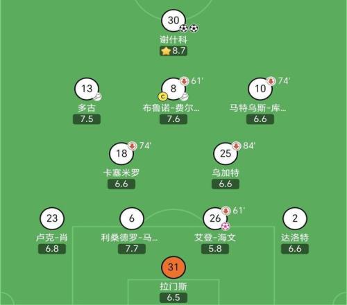 谢什科突前,身后是多古、B费和库尼亚,卡塞米罗和乌加特搭档双后腰。