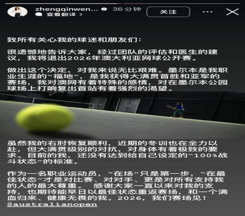 今天(1月8日)下午,郑钦文在个人社交平台上宣布,经过团队评估和医生建议,她将退出2026年澳大利亚网球公开赛。