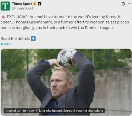 泰晤士报消息,世界顶尖的界外球教练托马斯-格罗内马克一直在以顾问的身份与阿森纳合作,他参观了枪手的训练场,并分享了自己的技术和知识,北伦敦豪门正进一步致力于把定位球战术打造成他们的制胜武器。