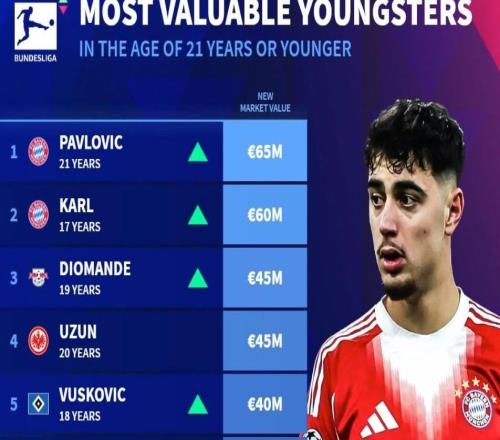 北京时间12月19日,在更新了德甲球员的身价之后,德转列出了此次更新后德甲身价最高的10名U21球员,亚历山大-帕夫洛维奇6500万欧元第一,伦纳特-卡尔6000万欧元第二,比朔夫4000万欧