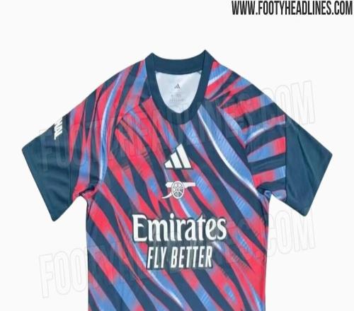 近日,知名装备网站FootyHeadlines曝光了阿森纳下赛季的赛前热身服谍照。该款赛前球衣设计大胆且充满活力,以深藏青色作为基础色,搭配红色和浅蓝色笔触风格的斜线图案。阿迪达斯