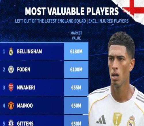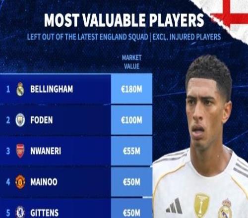 英格兰队公布了最新一期球队大名单,德转盘点了本次未能入选的球员身价榜(受伤球员除外)。1、贝林厄姆 (皇家马德里)1.8亿欧2、福登(曼城) 1亿欧3、恩瓦内里(阿森纳) 5500万欧4、科比-