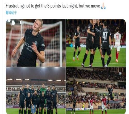 雷速体育10月3日宣 曼城在第二轮欧冠比赛中2-2战平摩纳哥,被对手90分钟点射绝平。哈兰德完成梅开二度难救主。哈兰德更新社交媒体写道:“昨晚没能拿到三分很沮丧,但我们会继